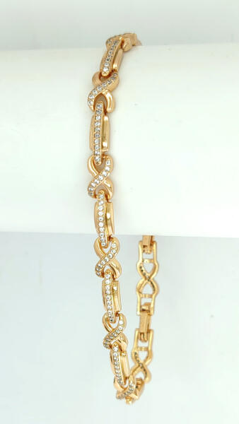 Aranyszínű, végtelen motívumokkal díszített karkötő, melyet fehér cirkónia kristályok tesznek csillogóvá. A kristályok karmos foglalatban helyezkednek el, a karkötő teljes hosszát díszítik. Időtálló ékszer, nem feketedik víz hatására sem. Mindennapi használatra is tökéletes választás. Antiallergén ékszer. 18K arany színben kapható. Karkötő szélessége: 5 mm. A