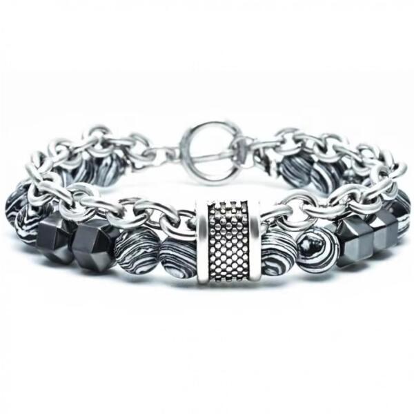 Gabor karkötő Mutatós karkötő színes gyöngyökkel és robusztus fém láncokkal, amely tökéletes kiegészítő azok számára, akik szeretik az egyedi és modern stílust. A fém részletek eleganciát adnak a karkötőnek, míg robusztus felépítése hosszú élettartamot és kényelmes viseletet garantál. Ez a karkötő ideális mindennapi viseletre és különleges alkalmakra, amikor