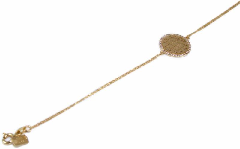 Modern stílusú, vékony dupla soros anker láncon cirkónia kövekkel és áttört mintával díszített kör alakú betéttel kombinált állítható méretű arany karkötő.