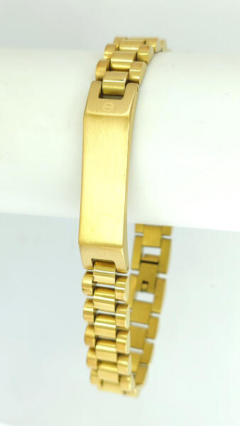 Aranyszínű nemesacél (316L) szemes karkötő gravírozható betéttel. Tartós, minőségi ékszer, nem feketedik nem színezi a bőrt. Antiallergén ékszer. 14K arany színben kapható. Szélesség: 10 mm. Gravírozható betét mérete: 10 mm x 28 mm. A gravírozást partnerünk végzi, kérjük előre utalásos, vagy utánvétes fizetési módot válasszon, az utaláshoz szükséges adatokat
