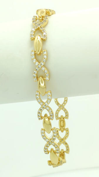 Aranysárga színű, végtelen jelet formázó szemekből összeállított karkötő, melyet fehér cirkónia kristályok tesznek csillogóvá. A kristályok karmos foglalatban helyezkednek el, akarkötő teljes hosszát díszítik. Időtálló ékszer, nem feketedik víz hatására sem. Mindennapi használatra is tökéletes választás. Antiallergén ékszer. 14K arany színben kapható. Karköt