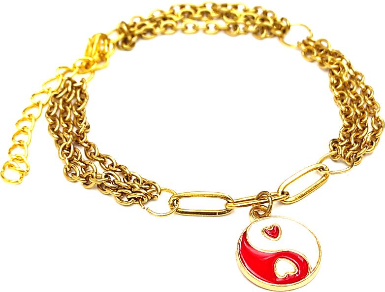 Három soros divat karkötő piros-fehér szív motívumos jin-jang charmmal, arany színű. Paraméterek: Charm mérete kb. 1,5 cm. Anyaga fémötvözet, karkötő anyaga rozsdamentes acél. Karkötő mérete 17+5 cm. (Ha ettől eltérő méretet szeretnél, rendeléskor a MEGJEGYZÉSBE írd be. )