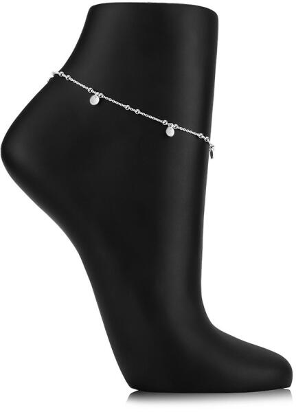 925 ezüstből készült bokalánc vékony ovális láncszemekből álló lánccal, amelyek függőlegesen kapcsolódnak egymáshoz. A láncon fényes gyöngyök vannak, párban elrendezve. A karkötőt egyszerű fényes körök díszítik, amelyek a gyöngyök közé vannak erősítve. A lánc állítható hosszúságú és rugós gyűrűzárral rendelkezik. Gyöngyök átmérője: 2 mmKörök á