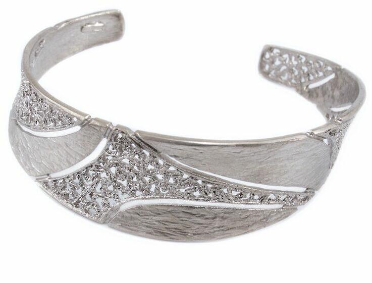 Modern stílusú, áttört kialakítású, mattított az egész felületen, tömör, igen mutatós, nyitott ezüst karperec.