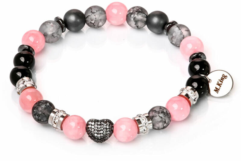 Gyönyörű jáde, ónix, hematit és hegyikristály karkötő, különleges rózsaszín és szürke kombinációja, megkoronázva egy remekül kidolgozott cirkóniummal kirakott szív dísszel. A szürke több árnyalatban fantasztikus kontrasztot ad a jáde finom rózsaszínjével, varázslatos az összhatás. Romantikus, finoman nőies ékszer. Ha szív dísz nélkül kéred a karkötőt, írd