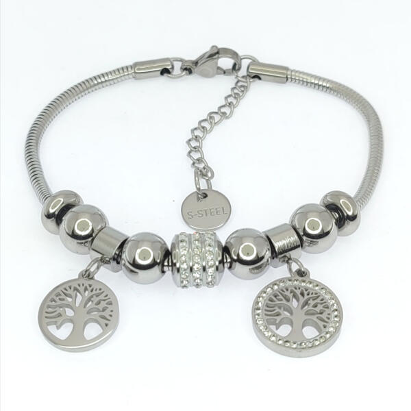Ezüstszínű nemesacél ( 316L ) pandora jellegű karkötő, melyet életfa charmok díszítenek és fehér cirkónia kristályok tesznek csillogóvá. A kristályok ragasztott foglalatban helyezkednek el. Mutatós, különleges darab. A karkötő delfin kapoccsal rendelkezik. Tartós, időtálló ékszer, nem feketedik, nem színezi a bőrt. Antiallergén ékszer. Karkötő hossza: 17 cm + 3 cm