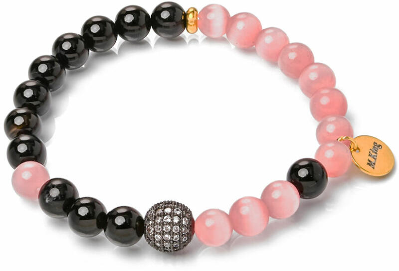 Ónix achát és holdkő karkötő, nagyon különleges szín és textúra párosítás, az ónix mélyfekete színe és a holdkő finom opálos rózsaszín árnyalata remek kontrasztot alkot és mégis harmóniát, nem túl fekete és nem túl rózsaszín, pont jó. A Maria King kollekció kiemelkedő darabja. Figyelem! A képen exkluzív kivitelű, rugalmas karkötő látható kapocs nélkül, d