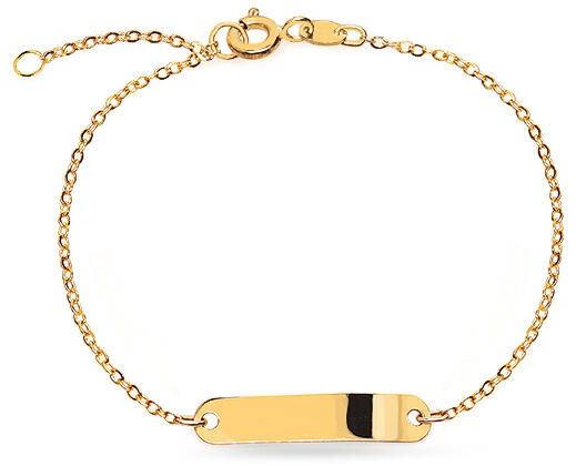 Ez a gyermek karkötő 14 karátos aranyból készült, amelyet fényes felülettel kezeltek. A lemez alkalmas a dátumok, kezdőbetűk, monogram és hasonlók gravírozásra.