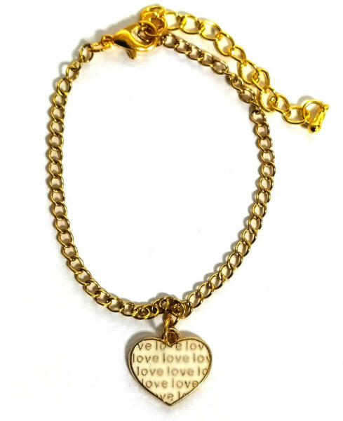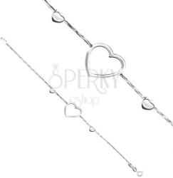925-ös ezüstből készült karkötő, fényes lapos láncszemekből, kígyó formát alkotva. A lánc közepén egy nagyobb üreges szívecske díszeleg, míg a két oldalán kis tömör szívecskék találhatóak. Delfinkapocs zárás. A karkötő hossza: 185 mmA szívecske méretei: 17 x 15 mmA karkötő súlya: 2,4 gFémjelzéssel ellátott.