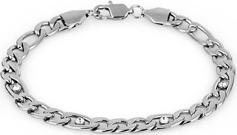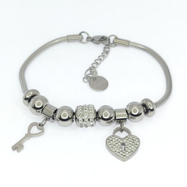 Ezüstszínű nemesacél ( 316L ) pandora jellegű karkötő, melyet szív alakú lakat, kulcs charm díszít és fehér cirkónia kristályok tesznek csillogóvá. A kristályok ragasztott foglalatban helyezkednek el. Mutatós, különleges darab. A karkötő delfin kapoccsal rendelkezik. Tartós, időtálló ékszer, nem feketedik, nem színezi a bőrt. Antiallergén ékszer. Karkötő hossza: 1