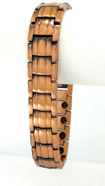 Aranybarna, antik hatást keltő nemesacél (316L) karkötő, melynek belső oldalán mágnesek találhatók. Tartós, minőségi ékszer, nem feketedik, nem színezi a bőrt. Mindennapi viseletnek is tökéletes választás. Antiallergén ékszer. Hosszúság: 21 cm. Szélesség: 15 mm. Igény esetén rövidíthető, melyet ajándékként elvégzünk. A kért méretet kérjük a megjegyzés rovat