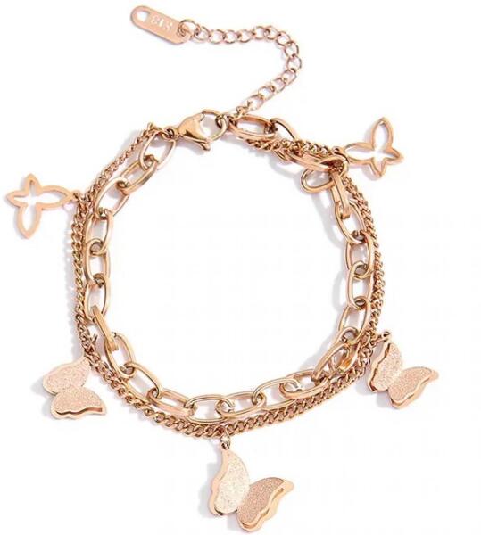 Vintage Butterfly Karkötő Szépséges, divatos Vintage Butterfly karkötő verhetetlen áron. A dupla soros karkötőt a teljes hosszán pillangó medálok díszítik, Önt is biztosan elbűvöli. Az ékszer nem tartalmaz nikkelt, ezért érzékeny bőrű emberek is viselhetik. Tulajdonságok: A karkötő hossza: 15cm + 3cm Díszítése: Pillangó medálok Anyaga: Nemesacél Szín: RózsaArany