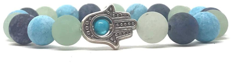 Egyedi ásvány karkötő Hamsa-védelmező kéz dísszel A 8mm-es Dumortierit, Türkiz és Aventurin ásvány golyókból készült karkötő speciális gumis damilra van fűzve, hamsa kéz díszítéssel. Amit a Dumortieritről tudni kell: A dumortierit nyugtatja és ellazítja idegrendszerünket, enyhíti az ezzel összefüggő panaszokat (pl. : belső nyugtalanság, stresszeltség, stresszes f