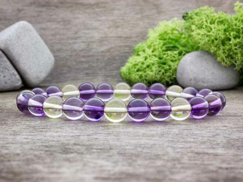 Az ametrin golyók gumira vannak felfűzve. Amit az ametrinről érdemes tudnod: Az ametrin az ametiszt és a citrin sajátságos ötvözete, amelyek a kvarc-csoport egyfajta keverékei. Az ametiszt egy tiszta kvarc a magnézium jelenlétével, a citrin pedig a vassal. Az ametrin egyesíti mindkét kvarc hatásait és ezt kiegyenlítő hatást tovább is adja nekünk, függetlenül attól mikét h