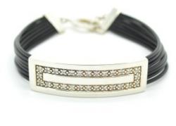 Kaucsuk karkötő ezüst díszítéssel, strasszokkal díszítve, több soros. - Hossz: 17,5 cm - Kaucsuk szélesség: 9,5 mm - Kaucsuk magasság: 1,3 mm - Ezüst dísz mérete: 1,25 cm x 0,5 cm x 4 cm (sz * m * h ) - Súly: 17 gramm