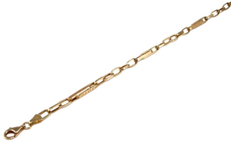 Modern stílusú, mattított mintával díszített összetolt szemekkel kombinált anker szemkötésű, üreges, de masszív kialakítású arany karkötő.