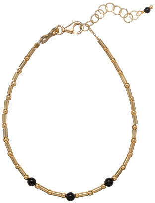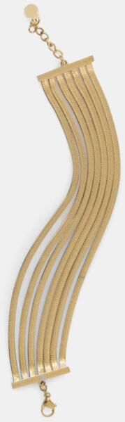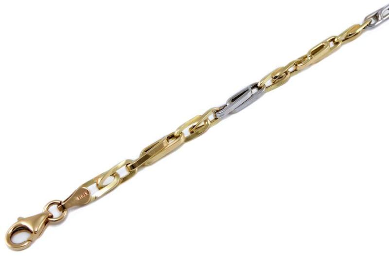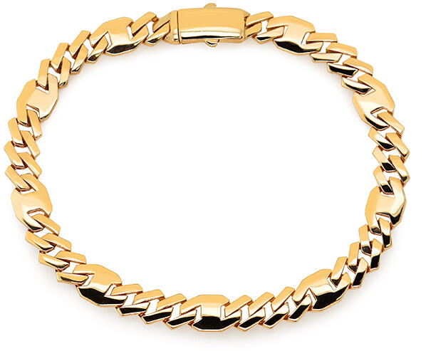 Modern stílusú, üreges, de masszív kialakítású, ródiummal díszített "barakka jellegű" arany karkötő.