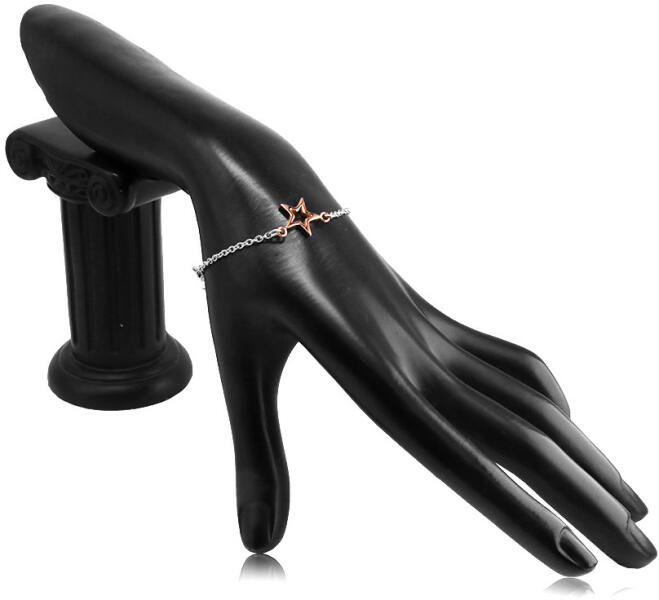 Az acél karkötő vékony ezüst színű láncból áll, amelyen három medál van réz színű csillag formájában. A két csillag enyhén domború és fényes, a hátulja lapos. A nagyobb csillagnak vastagabb és fényesebb a körvonala. Homár karmos rögzítés. Kis csillagok: 9 mm Nagy csillag: 13 mm A karkötő szélessége: 1,9 mm Hossza: 200 mm Az ár egy darabra vonatkozik.