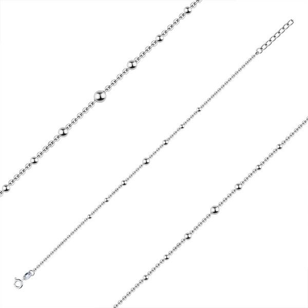 A 925 ezüst karkötő egy függőlegesen összekapcsolódó kerek láncszemekből álló lánccal. A láncot sorban, öt sima fényes golyó díszíti. A legnagyobb középen helyezkedik el, a golyók kifelé haladva egyre kisebbek. A karkötő hosszabbító lánccal rendelkezik, és rugós gyűrűzárral rendelkezik. A lánc szélessége: 1,7 mmGolyók átmérője: 5 mm, 4 mm, 3 mm. A karkötő