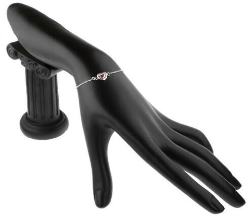 A sterling ezüstből készült karkötő alapját egy egyszerű láncocska alkotja. A lánc közepén rózsaszínű anyaggal kitöltött szívecske található. A szív közepe fényes, a beágyazott cirkonkövek szintén rózsaszínűek. Delfinkapoccsal záródik. A háromszög mérete: 7 x 7 mm Lánc hossza: 160 mm Plussz hossz: 20 mm Teljes hossz kihúzással: 180 mm (+/- 5 %) A karkötő súl