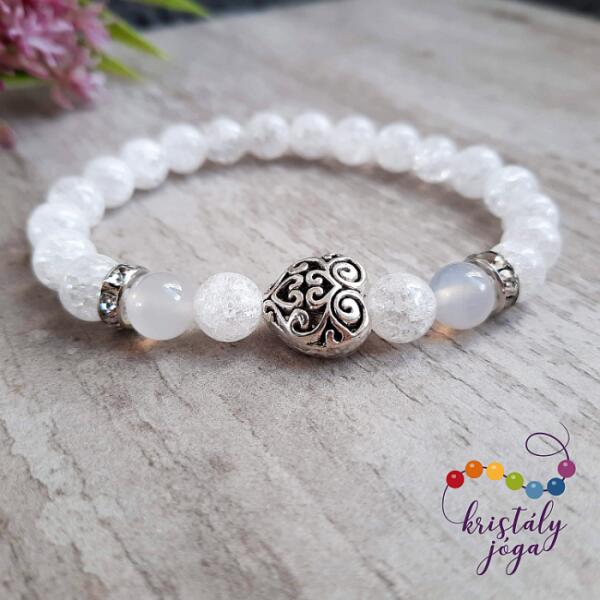 A fehér achát megtanít hogyan szeressük és tiszteljük magunkat. Földel, megnyugtat, segít a túlzott izgatottság vagy pánikroham leküzdésében. Támogatja a békességet, remek meditáló kő mert a koronacsakra működését harmonizálja, elősegíti a spirituális fejlődést. A hegyikristály a leghatékonyabb gyógyító és energiafelerősítő, a 12 mesterkristály egyike. Megti