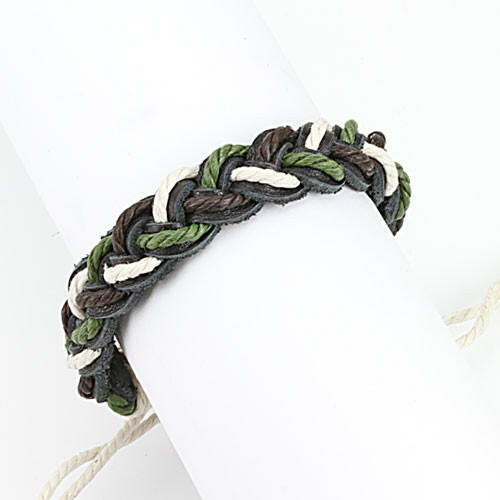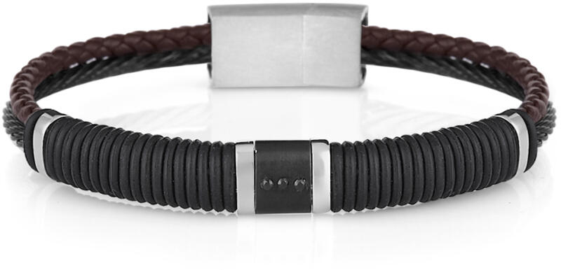 A fonott mintás karkötő bőr és színes fonott zsinórok kombinációjából áll. A fonatot két fekete bőr sáv és vajszínű, sötétbarna és zöld fonott zsinórok alkotják. A karkötő hosszúsága a krémszínű zsinór segítségével állítható. Szélesség: 13 mmHossz: 200 mm (+/- 5%)A hosszabbító zsinór hossza: 100 mmAz ár egy darabra vonatkozik.