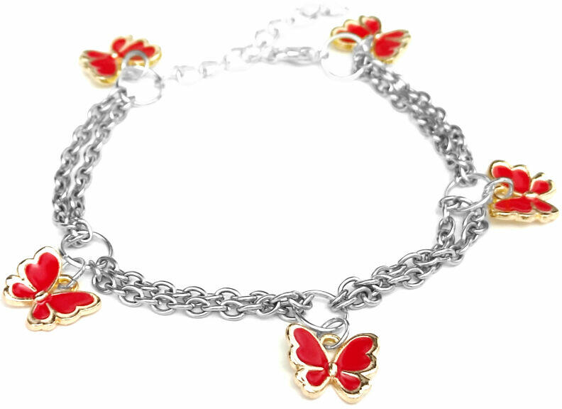 Karkötő mérete 17+5 cm. (Ha 20+5 cm vagy más méretet szeretnél, rendeléskor a MEGJEGYZÉSBE írd be. ) 5 pillangó charmos karkötő. Romantikus, látványos, feltűnő, mégsem túl sok. Paraméterek: Charm mérete kb. 1 cm. Charm anyaga fémötvözet. Karkötő anyaga rozsdamentes acél.