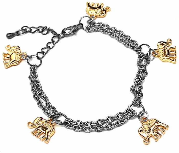 Elefánt os charmos karkötő, 5 charmmal. Paraméterek: Charm mérete 1,3 cm. Anyaga fémötvözet, karkötő anyaga rozsdamentes acél. Karkötő mérete 17+5 cm. (Ha ettől eltérő méretet szeretnél, rendeléskor a MEGJEGYZÉSBE írd be. )
