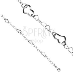 Sterling ezüstből készült karkötő szív alakú láncszemekből. Szabályosan váltakoznak a kis és nagy szemek - öt kis szívecske után egy nagyobb, ferde szív következik. Delfinkapocs zárás. A karkötő hossza: 190 mmA nagyobb szívek méretei: 12 x 7 mmA karkötő súlya: 2,7 gFémjelzéssel ellátott.