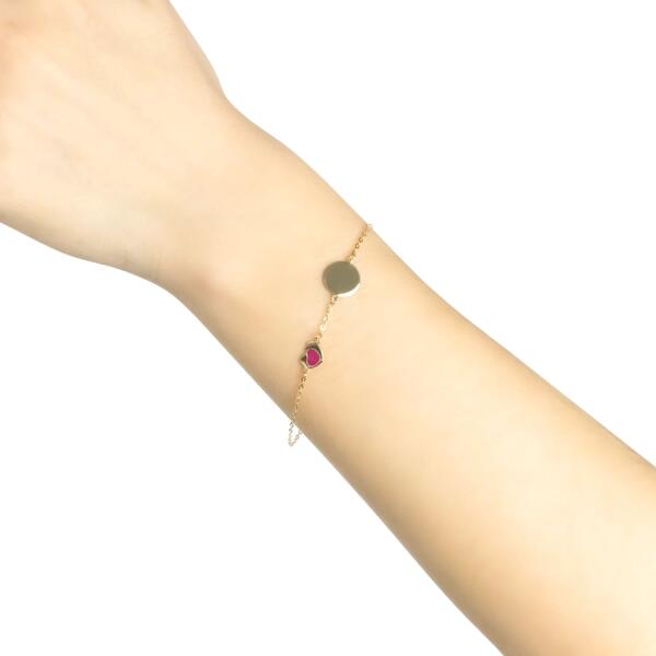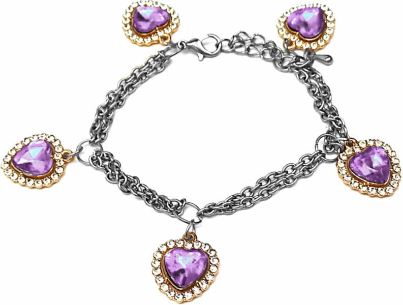 Az 585 sárga arany karkötő egy függőlegesen összekapcsoltt ovális láncszemekből álló lánccal. A díszítő részt két medál képviseli. Az egyik egy sima, tükörfényes felületű lapos korong, a másik egy fényes szív, benne egy kisebb, aszimmetrikusan elhelyezett szívvel. A szív rózsaszín mázzal díszített. A karkötő állítható hosszúságú, rugós gyűrűzárral rög