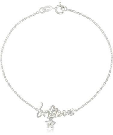 A 925 ezüst karkötő egy fényes dekoratív "believe" - "higgy" feliratból áll. Az "L" és "I" betű között egy kerek gyűrű helyezkedik el, amelyen egy átlátszó cirkónia csillag függ fényes és sima körvonallal. A láncot kerek szemek alkotják, amelyek egymásra merőlegesen vannak összekapcsolva. Karkötő rugós karika kapoccsal. A díszes rész mérete: 26 x 9 mm A csillag mér