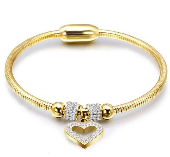Dionisa Karkötő Modern Dionisa karkötő verhetetlen áron. Az ékszer nem tartalmaz nikkelt, ezért érzékeny bőrű emberek is viselhetik. A karkötőt csodaszép szívecske medál díszíti. Tulajdonságok: A karkötő átmérője: 6cm Szín: Arany Anyaga: Nemesacél
