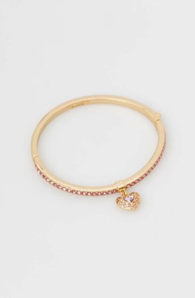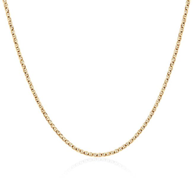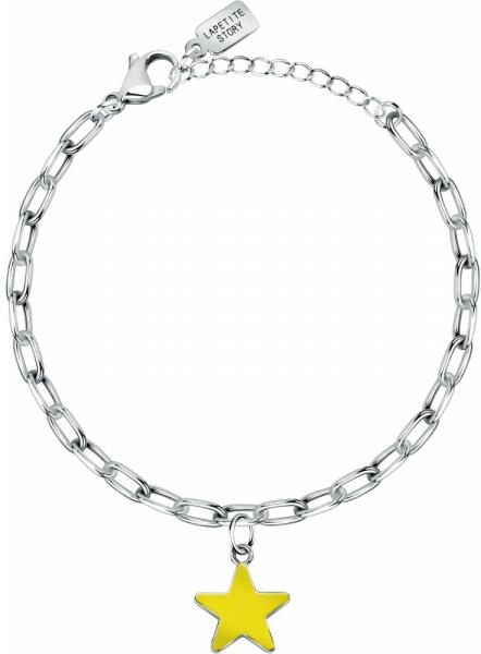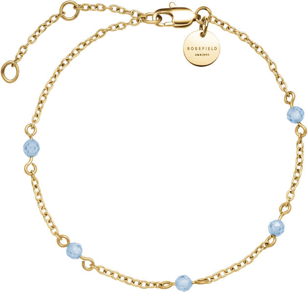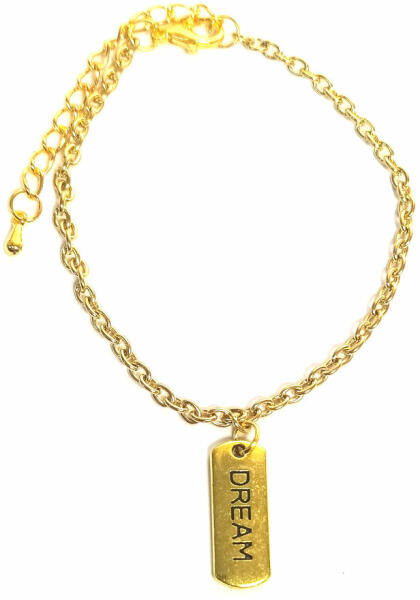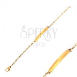 A 316L acél karkötő arany színű és ferdén összekapcsolt, ovális szemekből álló láncból tevődik össze. A közepén egy keskeny, hosszúkás tábla található, felváltva elhelyezett fényes és matt sávokkal díszítve. A karkötő delfinkapcsos zárszerkezettel rendelkezik. Lánc szélessége: 2 mmHossz: 170 mm (+/- 5 %)Tábla méretei: 5 x 38 mm