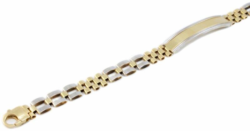 Modern, könnyed kialakítású, üreges, gravírozható betéttel ellátott, ródiummal díszített arany karkötő.