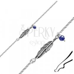 925 ezüst bokalánc, középen rögzített madártoll medállal, amit mindkét oldalról fényes patinás vésett minta díszít. A madártoll egyik végéhez sötétkék gyöngy lett rögzítve. A lánc egymásra merőlegesen forrasztott ovális szemekből épül. A lánc delfinkapoccsal készült és hosszabbítható. A lánc szélessége: 1,4 mmA lánc hossza: 230 mmA toldólánc hossza: 25 mm