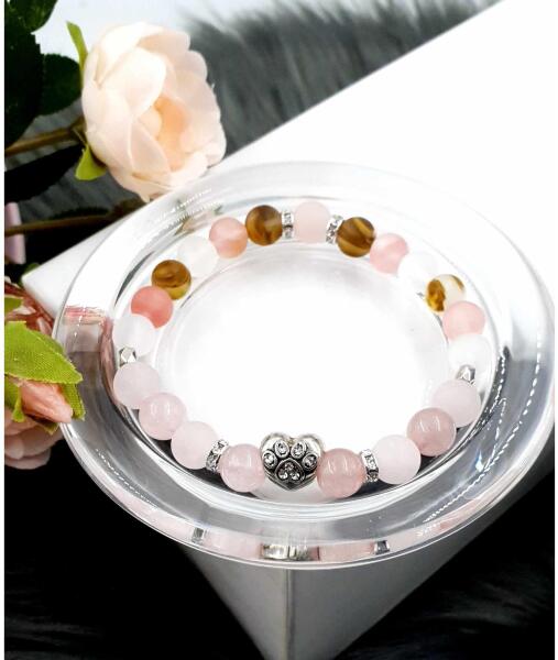 Egyedi tervezésű rózsaopál és matt rózsakvarc ásványokból készült kutya szívecske tappancs medálos ásványkarkötő. A medál egyik oldalán tappancs szimbólum van, strasszos kövekkel kirakva, a hátoldalán "I LOVE MY PET" felirat látható. Ha a medál nyerte el a tetszésedet, de másfajta stílusban szeretnéd a karkötőt, töltsd ki az : "Alkosd meg egyedi ékszeredet! oldalt