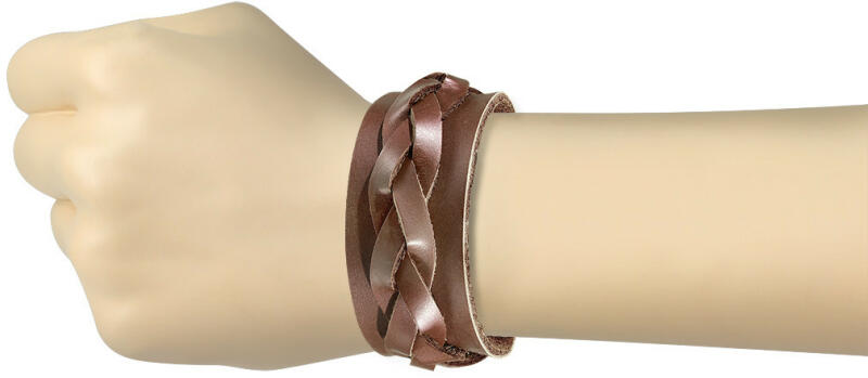 A bőr karkötő egy szélesebb sötétbarna pánttal, amelyre szegecsekkel egy fonott, mintás szíj van rögzítve. A karkötő állítható patentos záródással rendelkezik - két méretben. Szélesség: 27 mmTeljes hossz zárral: 170 mm, 200 mmA karkötő teljes hossza: 220 mm (+/- 5 %)Az ár egy darabra vonatkozik.