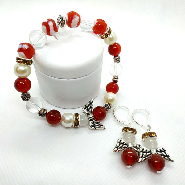 Haniel Arkangyal a szeretet, a béke és a harmónia Arkangyala. Az ékszer segít Neked érezni Haniel közelségét, megérezni a belső békéd, és a benned szunnyadó szeretetet. Oldja a belső érzelmi feszültséget. A karkötőhöz használt féldrágakövek: fehér jáde, karneol, hegyikristály, achát Fülbevaló: karneol, fehér jáde