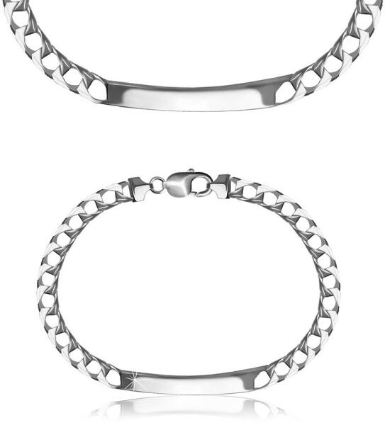 925 Ezüst karkötő, négyzet alakú lapos, szögletes láncszemekkel. A karkötőt középen egy hosszúkás alakú , simára csiszolt lemez díszíti. A karkötő homár karmos zárral rendelkezik. Karkötő hossza: 210 mm (+/- 5%)Láncszélesség: 6 mmLemezméret: 52 x 6 mm Karkötő hossza: 16,7 g Fémjel- van.
