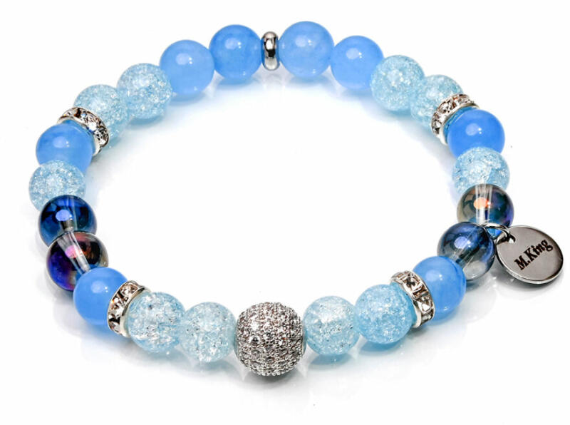 Gyönyörű kék aura kvarc, hegyikristály és jade karkötő, sejtelmes csillogás, különleges szín- és formavilág, minden, csak nem megszokott, hétköznapi. A jeges kékség elvarázsol és a hűvös elegancia magával ragadó. A Maria King kollekció kiemelt darabja. Figyelem! A képen exkluzív kivitelű, rugalmas karkötő látható kapocs nélkül, de kérheted extra erős acélsodron