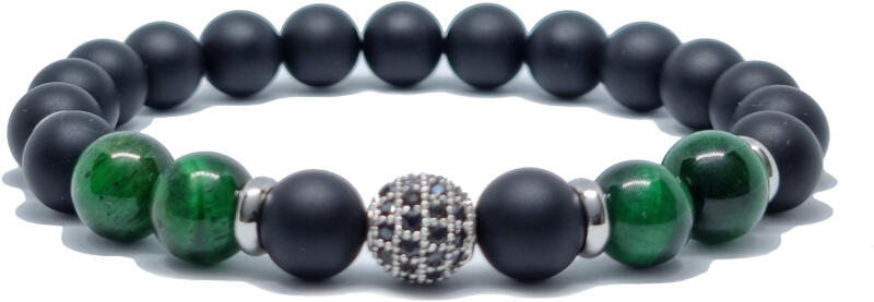 Kiváló minőségű valódi ónix ásványból készült ásvány karkötő. Az ónix karkötő mély fekete árnyalatával és erőteljes megjelenésével stílusos kiegészítő, amely magabiztosságot és stabilitá st sugall viselőjének. A karkötő valódi ónix matt, zöld tigrisszem 8-9 mm ásványból és nemesacél köztes és cirkón gömb dísszel készült. Az ásvány, karkötő fo