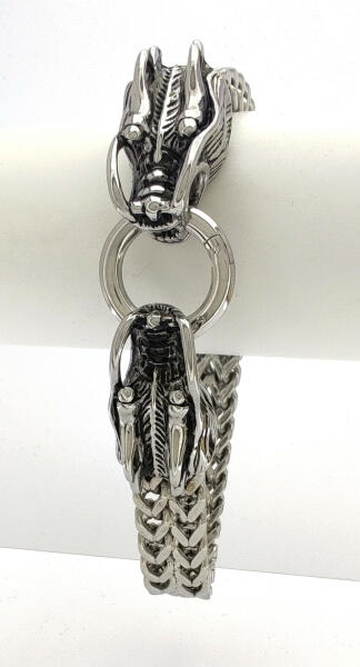 Ezüstszínű nemesacél (316L) kétsoros fonott karkötő, melyet két sárkány fej díszít. Karabíneres zárral rendelkezik. Tartós, minőségi ékszer, nem feketedik, nehezen karcolódik. Mindennapi viseletnek is tökéletes választás. Antiallergén ékszer. Karkötő hossza: 22,5 cm. Karkötő szélessége: 12 mm. Oroszlán fejek mérete: 16 mm x 29 mm. A nemesacél ékszerek rendkívül