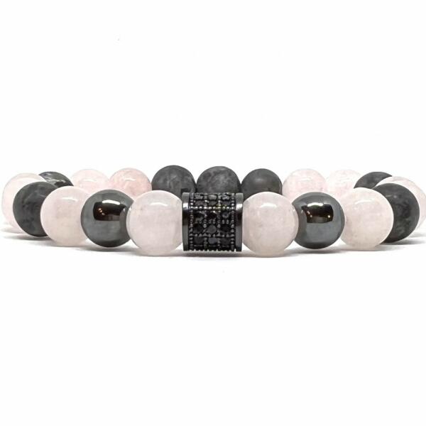 Cirkón gyöngy díszítésű Shamballa ásvány karkötő A 8mm-es Labradorit, Hematit és Rózsakvarc ásvány golyókból készült karkötők speciális gumis damilra vannak fűzve, fegyveracél Cirkón henger díszítéssel. A hematit egy erős energiakő, segítségével a többi ásványi követ is feltölthetjük. A Hematit ásvány testi lelki hatásai: A hematit körénk ""épít"" egy v