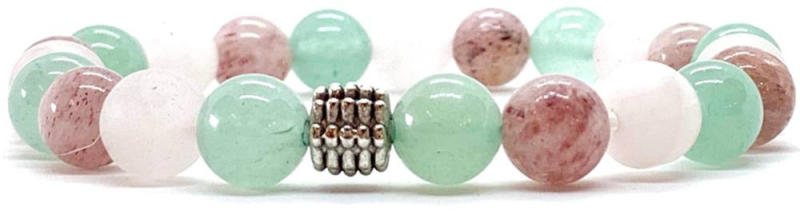 Egyedi ásvány karkötő A 8mm-e Aventurin, Rózsakvarc és Eperkvarc ásvány golyókból készült egyedi ásvány karkötő speciális gumis damilra van fűzve, fém köztes díszítéssel. Amit a Rózsakvarc ásványról tudni kell: A festetlen rózsakvarc az egész világos, szinte áttetszőtől, a ködös középrózsaszínig terjed. Az egyik legnépszerűbb kövek egyike, amely szépsége