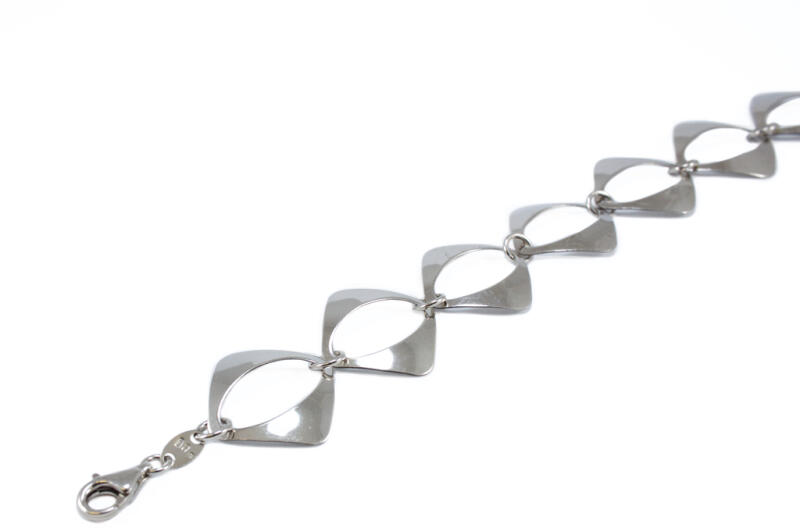 Modern stílusú és kedvelt fazonú, négyszögletes áttört szemekből álló, ródiummal díszített, mutatós ezüst karlánc.