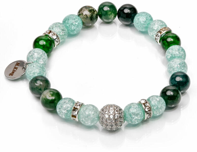 Különleges zöld csillogás ebben a moha achát és hegyikristály exkluzív ásvány karkötőben, a természet érintése és egy kis plusz ragyogás a mindennapokba. Figyelem! A képen exkluzív kivitelű, rugalmas karkötő látható kapocs nélkül, de kérheted extra erős acélsodronyra is delfinkapoccsal és 5 cm hosszabbítólánccal. Ha a kapcsos verziót kéred, ami nem szakad, nem ny