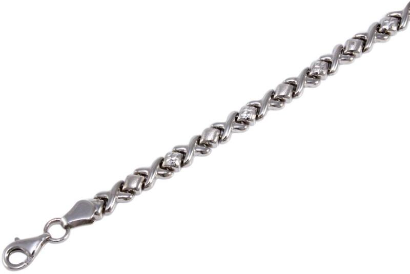 Modern stílusú, ródiummal bevont, véséssel és mattítással díszített, üreges kialakítású, stiftes, mutatós fehérarany karkötő.