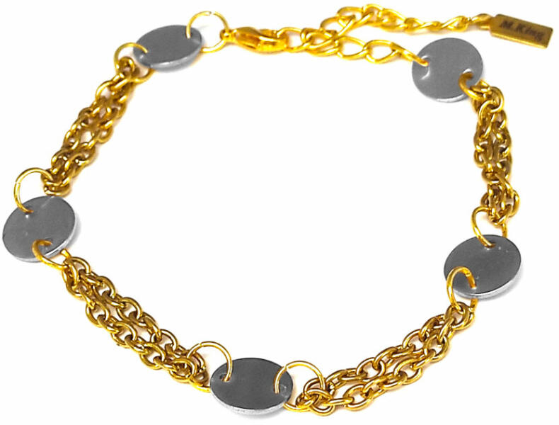 Karika charmos karkötő, 5 charmmal. Paraméte rek: Charm mérete 1 cm. Anyaga nemesacél, karkötő anyaga rozsdamentes acél. Karkötő mérete 17+5 cm. (Ha ettől eltérő méretet szeretnél, rendeléskor a MEGJEGYZÉSBE írd be. )