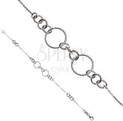Az ezüstből készült karkötő alapját fényes, négyszögletes szemekből álló lánc alkotja. A finom láncot középen három kisebb karikával összekapcsolt nagyobb körök díszítik. A középső díszen kívül még két, három kisebb karikából álló elem is díszíti a karkötőt. Hosszúság: 190 mmA karkötő súlya: 3,3 gFémjelzéssel ellátott.