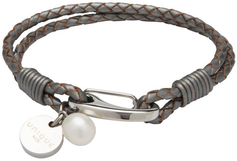 Rozsdamentes acél és bőr karkötő. Természetes bőr és rozsdamentes acél. Ezüstszürke szín. Különleges díszek a karkötőn: természetes gyöngy és medál Biztonsági zár. 19 cm-es méretben. Cikkszám : B436SG Szín : Ezüstszürke Karkötő anyaga : Rozsdamentes acél és bőr Méretválaszték : 19 cm Nikkelmentes : Igen Vízállóság : nem vízálló Garancia : A termékre egy